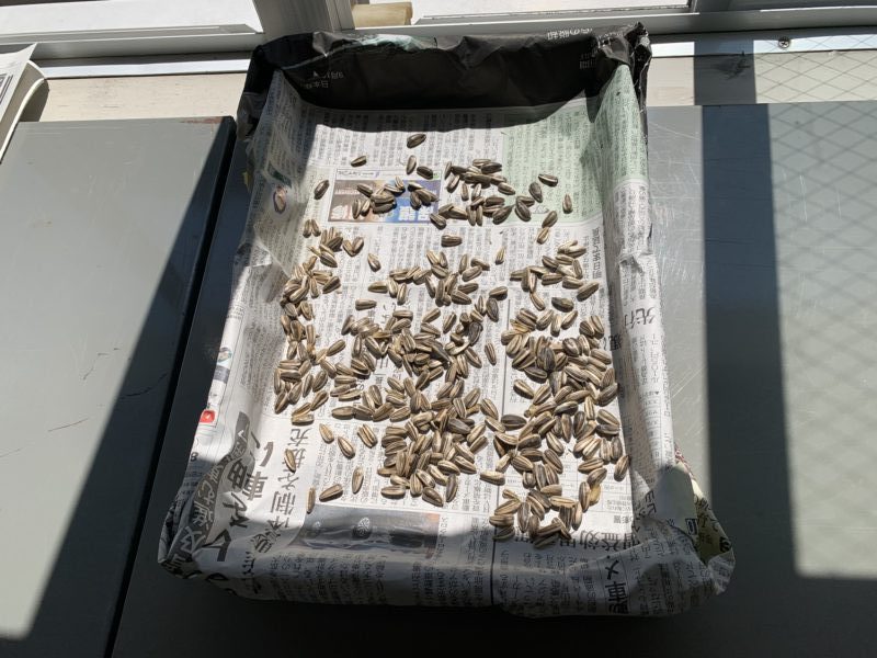 今年の5月、職場体験に来た興津中学の生徒さんからいただいた「はるかのひまわり絆プロジェクト」のひまわり(詳しくはHP8月5日の書き込みを見てください)が夏のあいだ元気に咲き誇り皆を明るく和ませてくれました。枯れた後降り続いた雨に悩まされなかなか乾いてくれなかったのですが、本日ネイチャークラブの佐藤先生が半分ほどを刈ってきたので皆で種を取りました。種の状態でもう少し乾燥が必要な感じです。残りの半分は花壇の中でもう少し乾燥させる予定です。(yagawa)