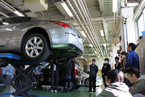 リフトを「上げまーす」の大きな声とともに車が持ち上がり、車体の下をのぞき車の構造を教わりました。