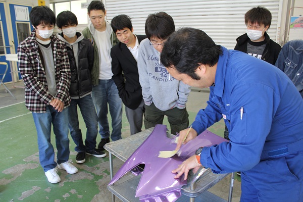 板金の実習場では、みんなの目の前で車のパネルに傷をつけへこませて、その修復の流れを実際に見てもらいました。