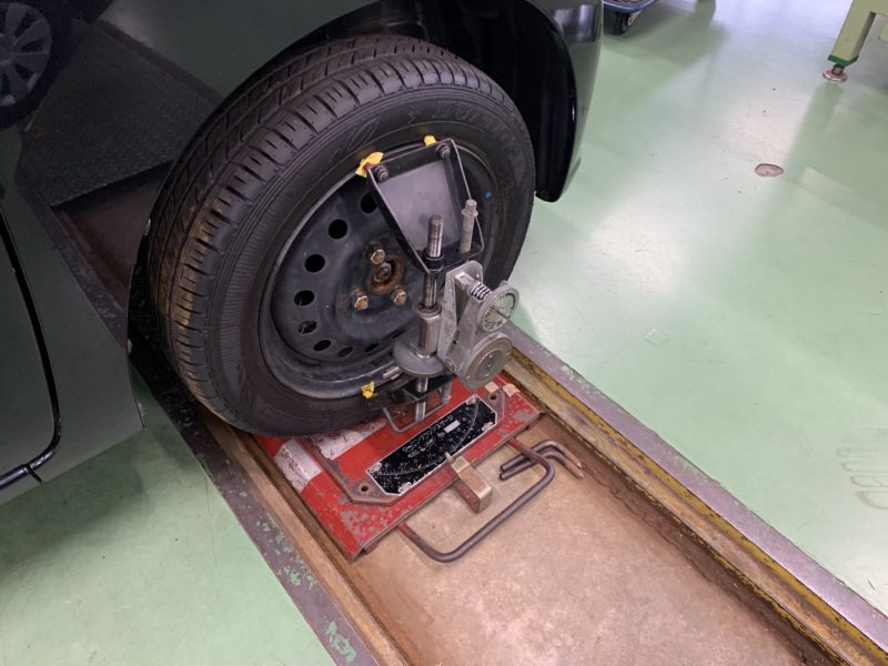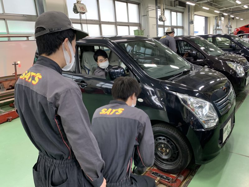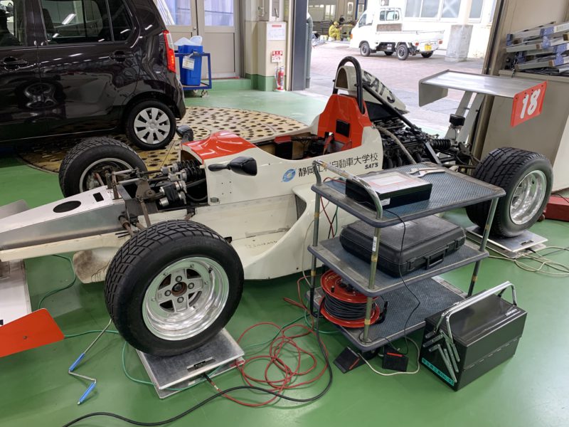 今日はシステム工学科2年生のアライメントの様子です。佐藤先生の指導のもとサイドスリップテスタで確認しながらのトゥの調整や、CCKゲージを取り付けての測定作業、4輪の輪荷重の測定などを行っています。WEBでの授業に圧迫されて、作業時間が短くなってしまい時間が大分タイトな様子。そんな中でも安全第一で楽しく学んでいました。(yagawa)