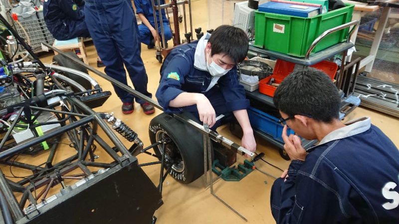 本日4時限目にアライメントの測定を実施しました。2019年度の車両について、バンプ時のアライメント変化について計測し、新しい車両のデータとしました。