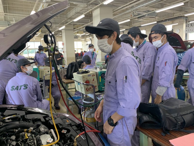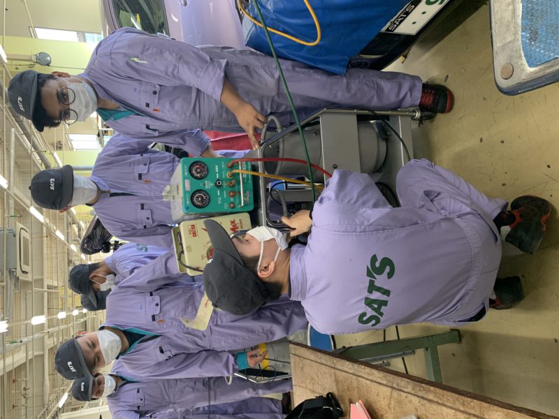 今日は国際オートメカニック科2年生の松下先生のエアコン実習の様子です。半数の学生はエアコンガスの回収、真空引き、チャージの手順を反復練習しています。午後試験のようです。半数の学生は車両からエアコンのユニットを外して、冷凍サイクルを形成している部品の実物の確認やその取り付け位置の確認しています。(yagawa)