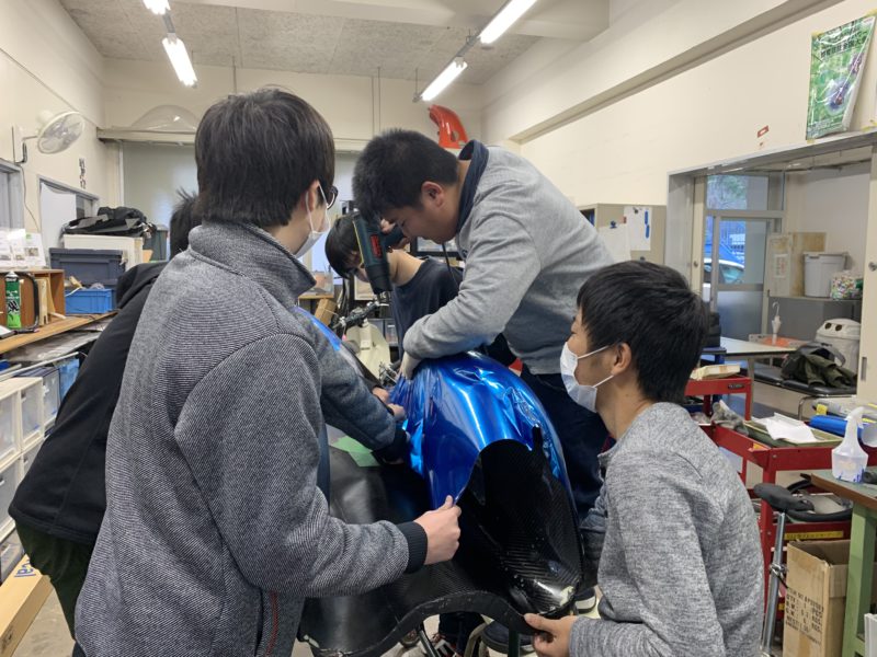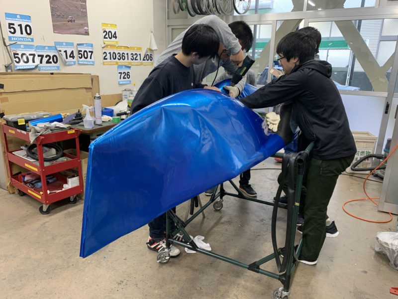 デビュー時は赤&黒だったんですが、ブルーのフィルムにするそうで、一人がヒートガンであぶりながら他の学生がフィルムを引っ張っています。