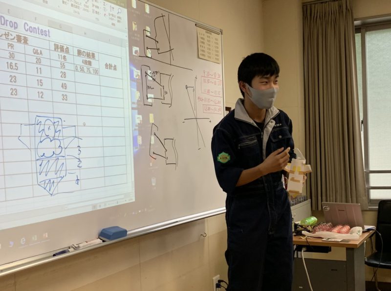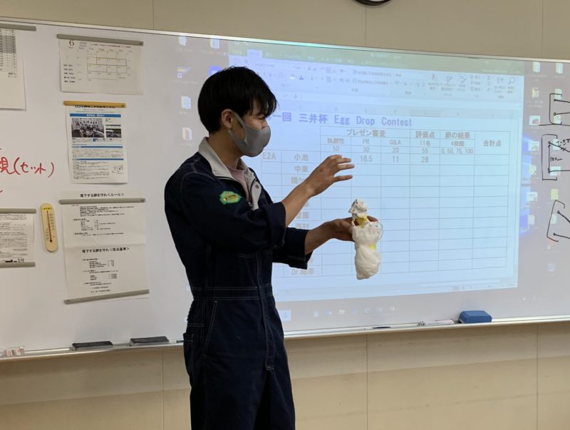 これは支給される材料のみを使用して保護装置を作成しその中に卵を入れて5mの高さから落とすという競技です。(もっと細かいレギュレーションがありますが…)落下後の卵の状態(割れたかどうか)だけではなくプレゼン審査などの得点もあり総合得点で順位が決まります。写真はプレゼンの様子。動画は落下させている絵となります。すべてのメンバーの卵の状態や順位は此処では書ききれませんが、落下した時の音などを聞いて卵の状態を想像してみてください。(笑)(yagawa)
