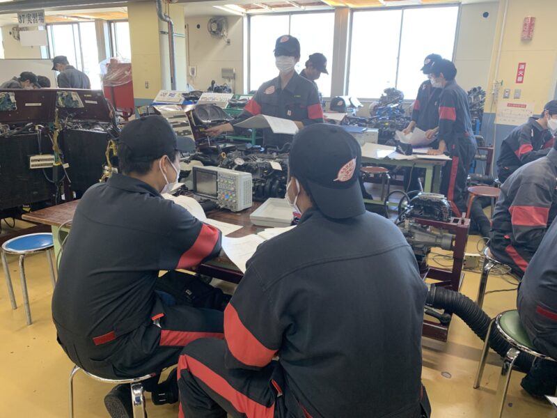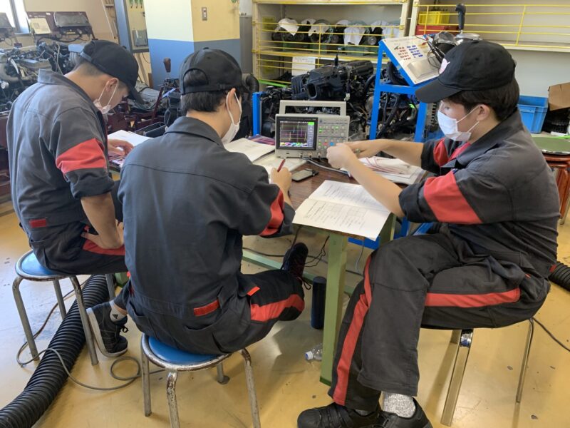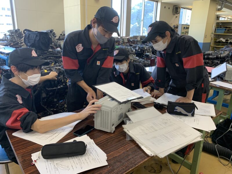 今日は自動車システム工学科2年Aクラス2班の授業の様子です。学生たちは夏休み明けの久しぶりの対面の実習授業。担当は私ヤガワなのですが、私自身も日本人の実習授業はホント久しぶりです。コンピュータからインジェクタへの噴射信号のあれこれをオシロスコープに映し出し、いろいろと考察していきました。(yagawa)
