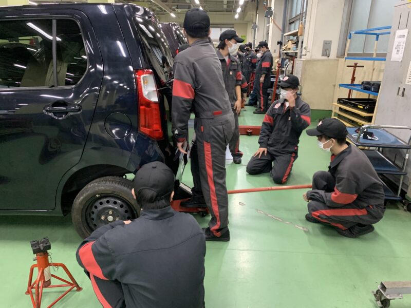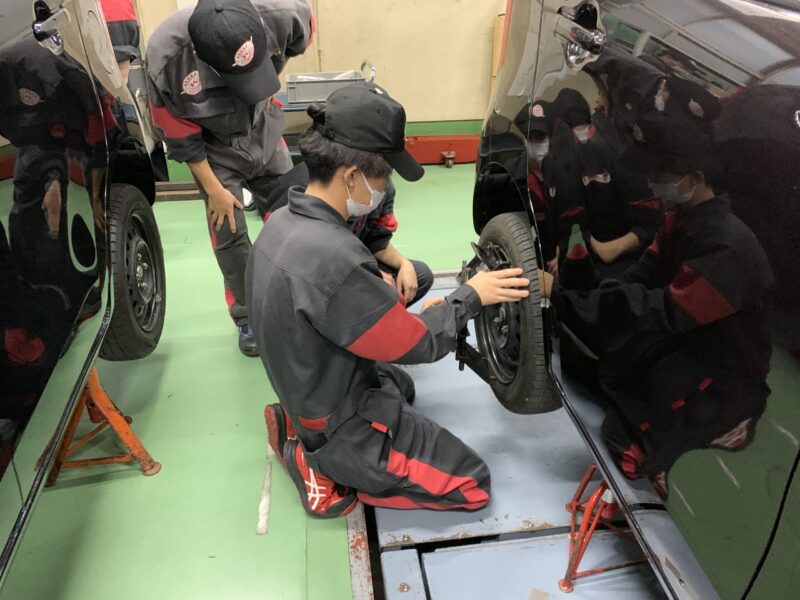 少し前の自動車システム工学科2年生の授業の様子です。ガレージジャッキで車両を持ち上げ、CCKゲージをつけて、キャンバーの測定をしたり、ターニングラジアスゲージの上でキャスター、キングピン傾角を測定したり。またトーインゲージでトーを測定したり。動きがあって楽しくやっていました。(yagawa)