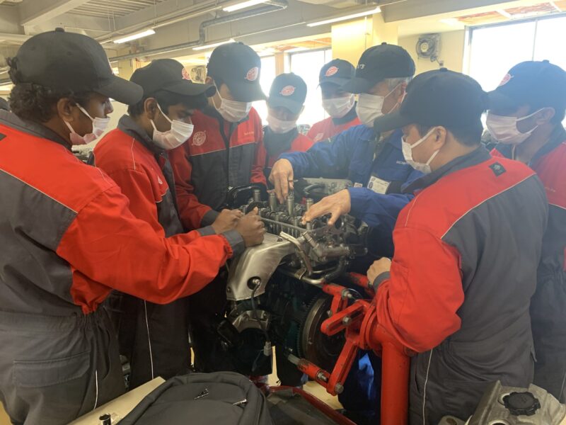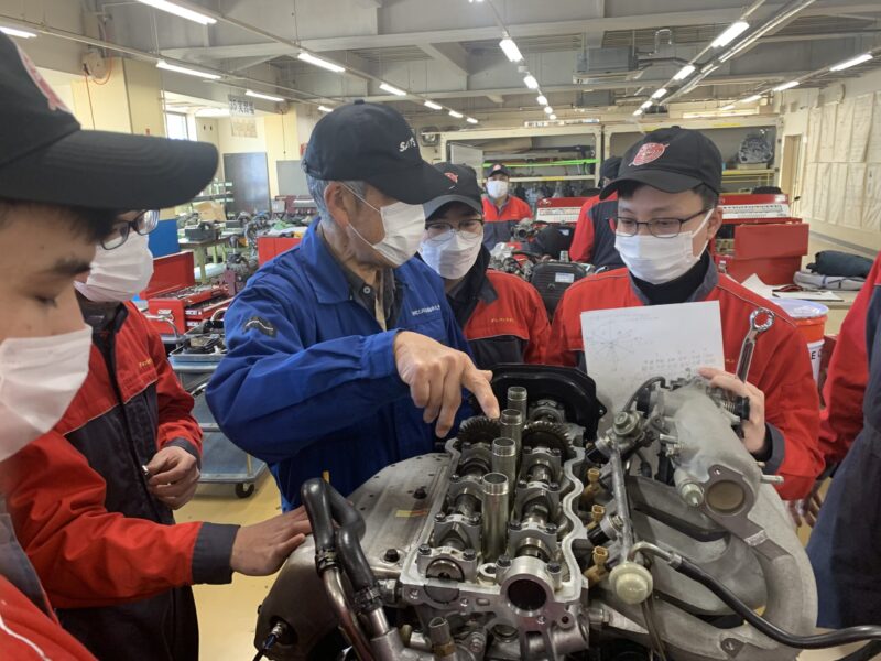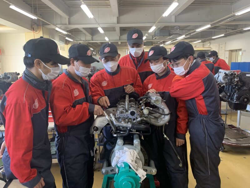 本日の国際オートメカニック科2年生の授業の様子です。昨日、「点火順序1-3-4-2の直列4気筒の〇番シリンダが〇〇上死点です。そこからクランクシャフトを〇〇度回転させると・・・」という問題を机上でばっちり理解したうえで、本日現物エンジンでの測定です。実際には1番と4番をそれぞれ圧縮上死点又は排気上死点にしてカムの向きを確認すれば全体のクリアランスは測定できるのですが、昨日の考え方と合わせて理解しながら測定していました。(yagawa)