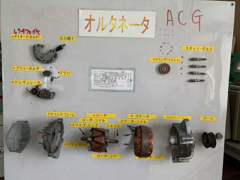 A2:答えは左から発電機の総称、交流発電機、直流発電機です。発電効率が良いので現代の車にはオルタネータが使用されています。写真はそのオルタネータの分解モデルです。クルマの勉強楽しいですね。(yagawa)