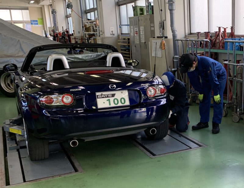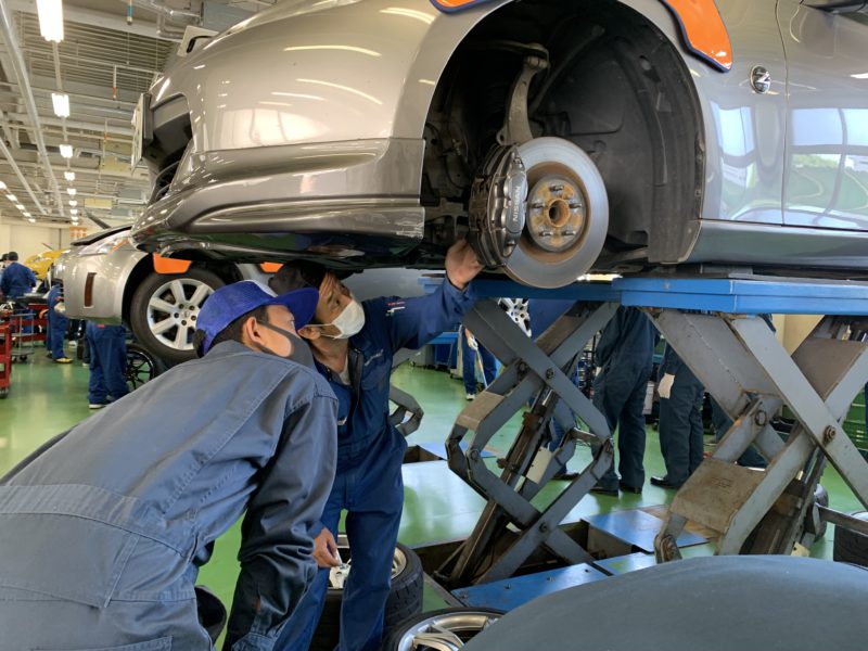 受付後、つなぎに着替えて早速実習場へ移動します。4~5人が1グループとなり担当教員とご挨拶。その後リフトの上げ下げ、タイヤの脱着などの基本作業 ~ 生徒さんの要望でヘッドカバーを外しているグループまで。(ツナギの色が似ていてわかりにくいですが黒い帽子が教員、青白が生徒さんです。)