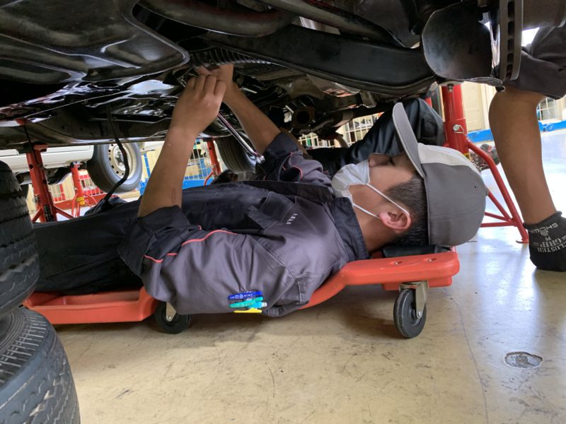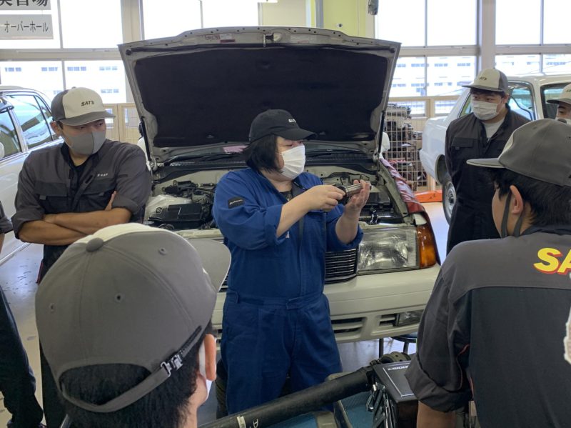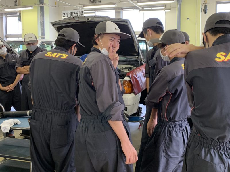 今日は自動車システム工学科1年生1班のクラッチ脱着実習の様子です。山本先生からプロペラシャフトの取り外し手順、注意事項の指示を受けて各車両の下に潜り込みます。私はこの学生たちに対してリモートでしか接していないので、学生は私のことを知っているけど、私は学生のことをほとんど知らないという変な関係です。(-_-;) (yagawa)