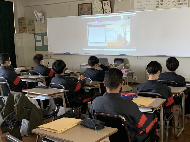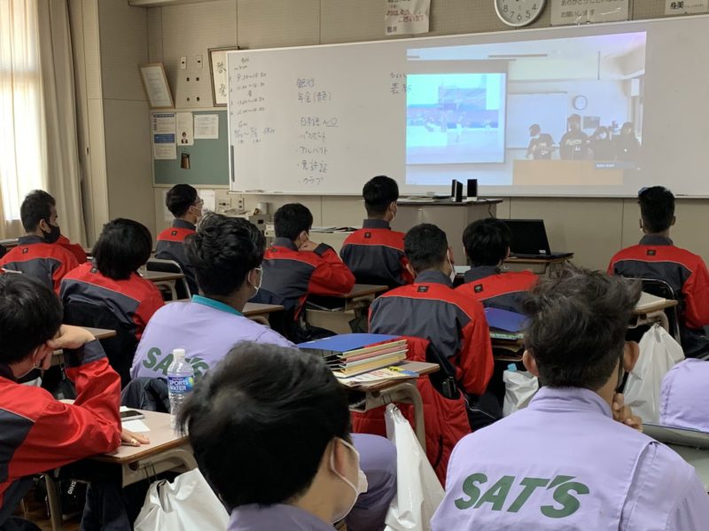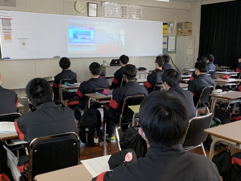本年度は密を避けるためWEBでの勧誘会となり、勧誘する側は学生ホールでカメラを前に説明。新入生は各教室のプロジェクターでその様子を見ます。
