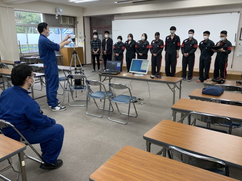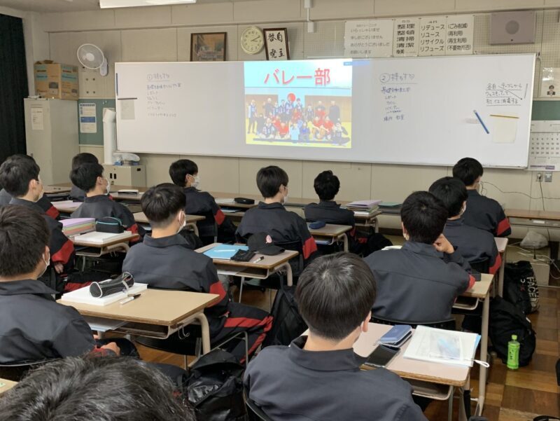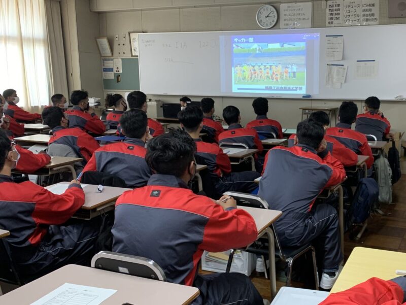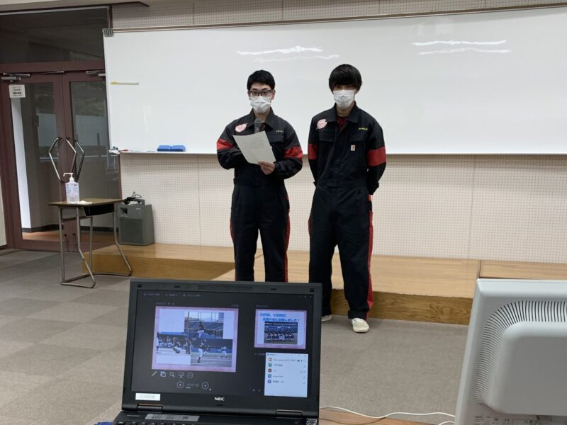 本年度も昨年度に引き続きWEBでの勧誘会となり、勧誘する側は学生ホールでカメラを前に説明。新入生は各教室でその様子を見ます。