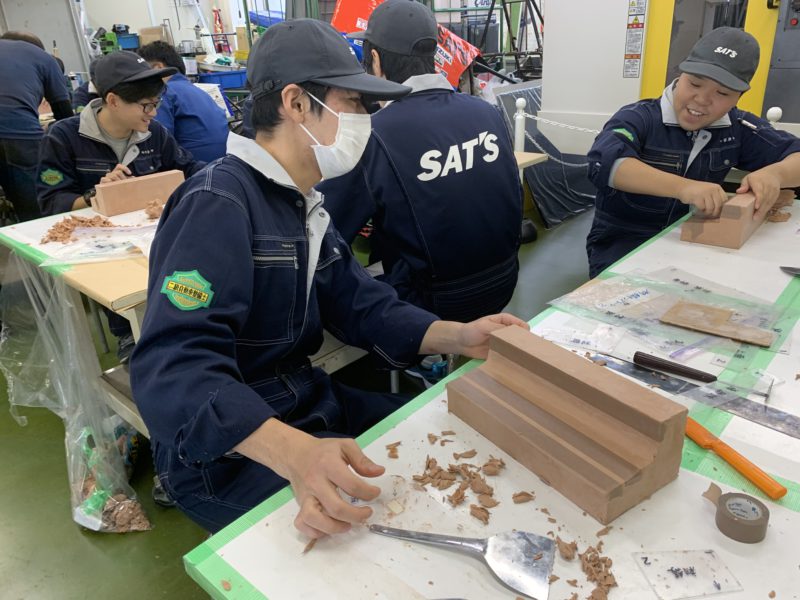 昨日ご紹介したクレイモデルの講習会の2日目です。午前中伺うと作業は次の段階に入っていました。ソファ形状の背もたれ部の手前上部の角にRをつけ、背もたれ部と座面部にクレイを盛り滑らかに仕上げるという作業に入っていました。夕方には座面手前の角も取れ、最後の仕上げとしてシルバーのフィルムの貼り付け作業です。完成品の紹介はまた次回!