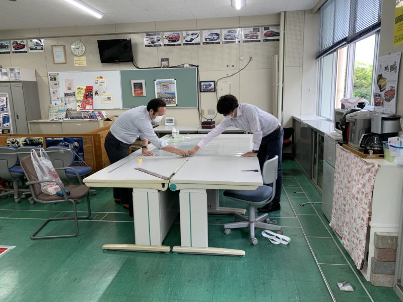 静岡県内の緊急事態宣言は解除されましたが、コロナウイルスの影響はまだまだ残っています。我々も普段の生活に戻るよう、警戒心を緩めることなく予防は万全にしながら、ある意味ウイルスと共存していかなければなりません。本校でも授業再開に向け、各箇所の衛生対策などガイドラインを急ピッチに進めています。広報・学生課でも以前から飛沫を防止するシートは貼ってありましたが、瀧先生、内藤先生に、より強力なシールドを張っていただきました。ありがとうございました。(yagawa)