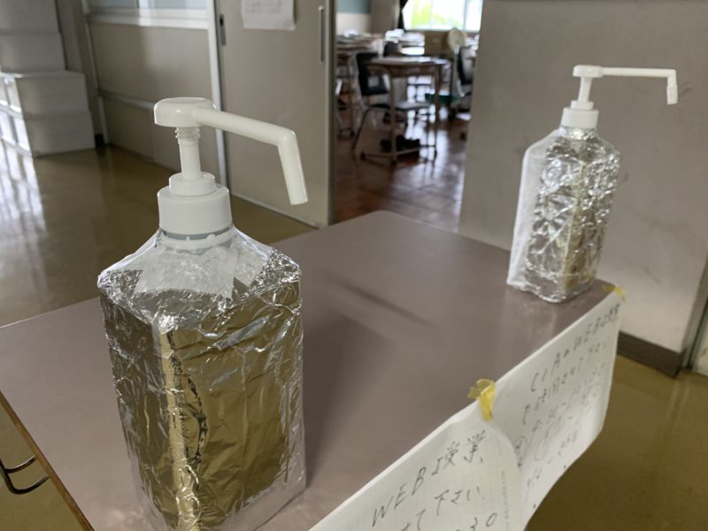授業再開に向け、各箇所の衛生対策などガイドラインを急ピッチに進めています。各教室にはコロナ禍以前からアルコール消毒液が置いてありましたが、今回の騒ぎで全く入手出来ず次亜塩素酸水に詰め替えています。皆さん、この次亜塩素酸は紫外線に当たると有効成分が減少してしまうことはご存知でしたか?ですので専用ボトル以外のボトルに詰め替える場合は写真のようにアルミ箔でボトル全体を覆ってお使いくださいね!(yagawa)
