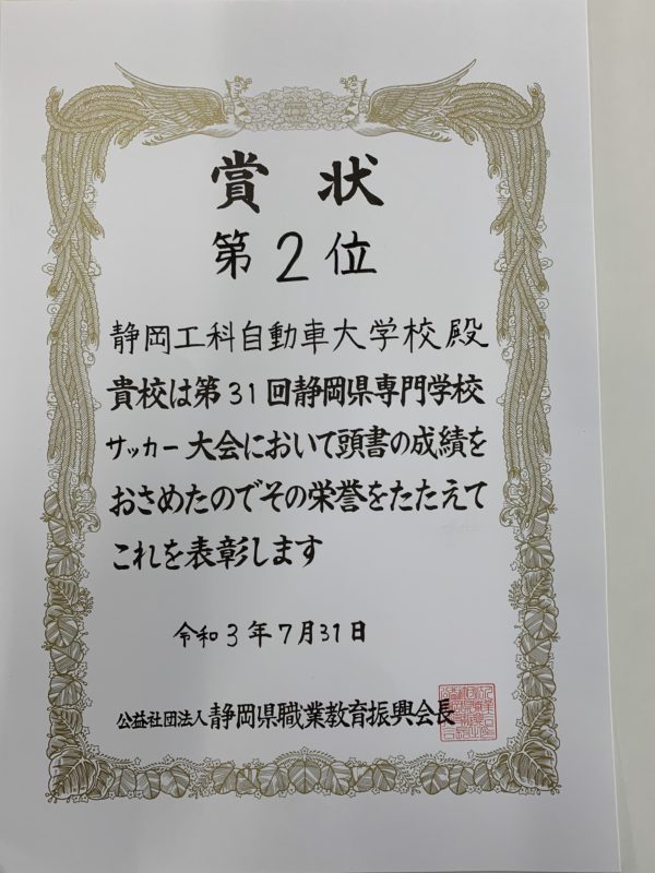 本年度の本校サッカー部は、予選リーグを2位で通過し決勝戦へコマを進めました。決勝戦では静岡医療学園専門学校さんに惜しくも敗れ第2位となりましたが全国大会への切符を得ることが出来ました。全国へ向けて様々な準備を進めていましたが、非情にも新型コロナウイルスの影響で中止との連絡が。更なる活躍を約束していただけに残念でなりません。県大会の賞状が届きましたので、皆様へのお礼とともに披露とご報告となります。「応援ありがとうございました。」(顧問&部員一同)