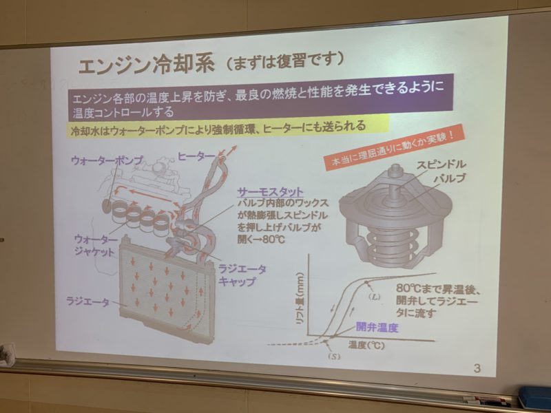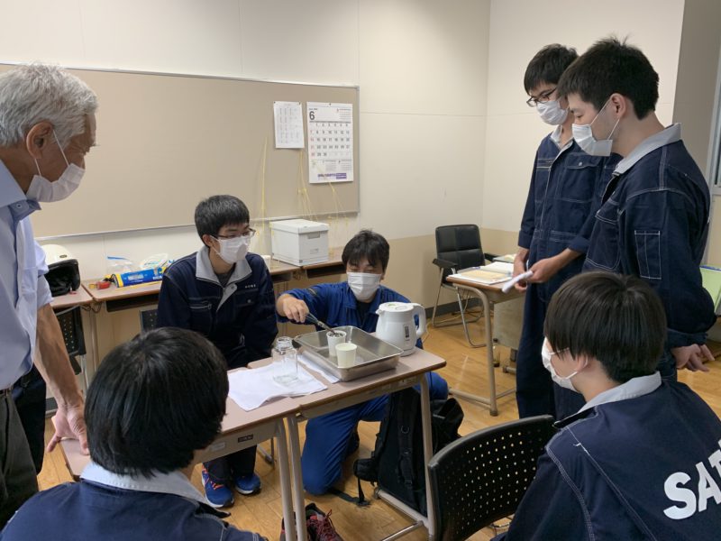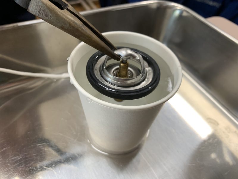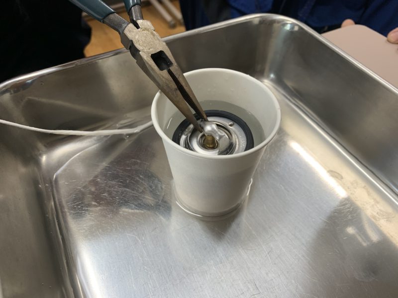 自動車システム工学科開発エンジニアコースの3年生です。今日は自動車工学の授業で「サーモスタットの動き」を確認しています。サーモスタットはエンジンの冷却水を適温に保つために約80℃で開いて冷却水をラジエータに導く弁です。1~2年次に勉強していますが、座学的な復習をするとともに現物で実際の作動を確認していきます。(yagawa)