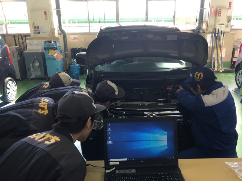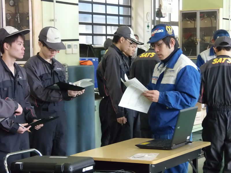 本日スズキ自販静岡様に御来校いただき、自動車整備科の1年Bクラス4班に対し企業様による実習を実施していただきました。これは企業様と連携を図り、最新技術や知識を身につけられるようカリキュラムを編成し、実践的な職業教育を行う専門課程となるよう平成26年より取り組んでいるものです。