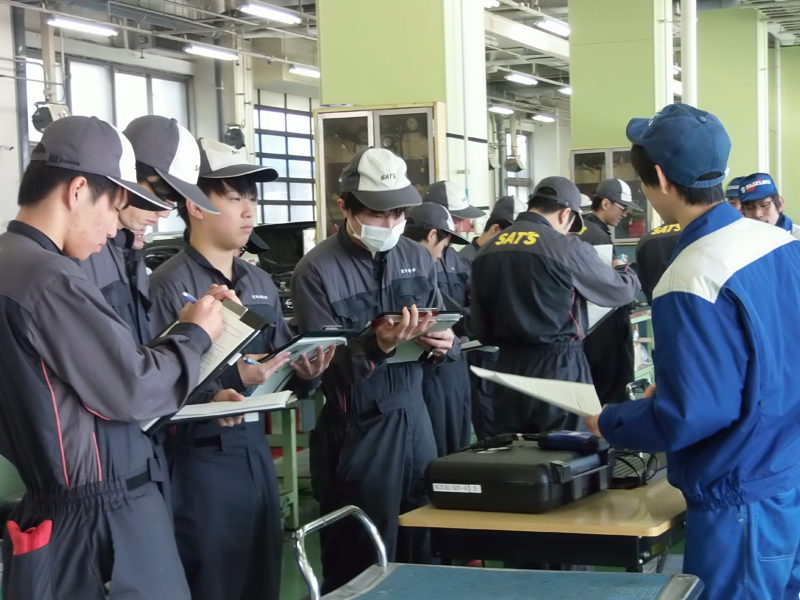 実習場では3グループに分かれ、故障現象の確認、車両の仕様の確認などを行い、診断機に繫ぎ故障診断を行っていきました。