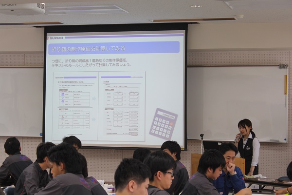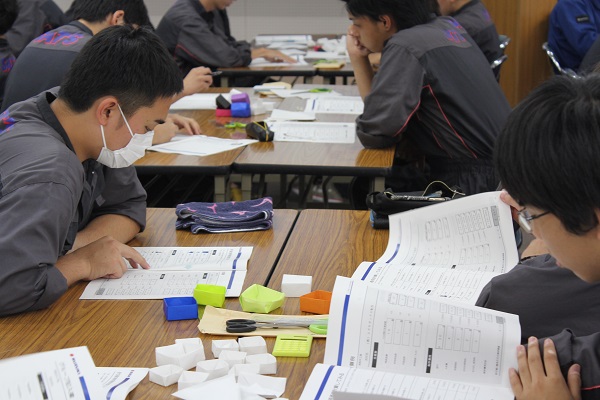 制限時間内に折り箱を作り、商品(きれいに完成できたもの)として出せる個数、出せない個数、生産性、コストについてチームごと話し合いを行いました。