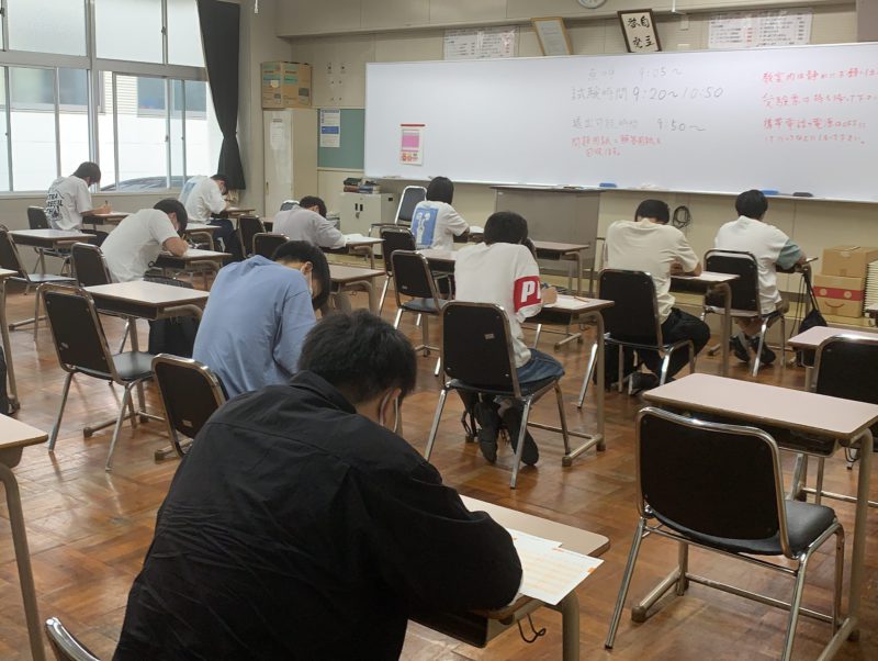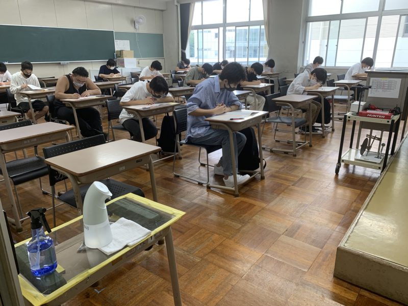 今日は土曜日ですが授業日で、ソーシャル検定という整備専門学校全体での統一試験の日です。静岡県に緊急事態宣言が発出されてから本校は完全WEB授業を展開していましたが、試験日ということで久しぶりの登校となりました。休校の学年の教室も使い三密を避けての受験です。必要以上のコミュニケーションは取れませんが「おはようございます」の生の声と、元気そうな姿が見れたので、受験風景をパチッ!あっという間に「さようなら」と帰宅していきました。涙 (yagawa)