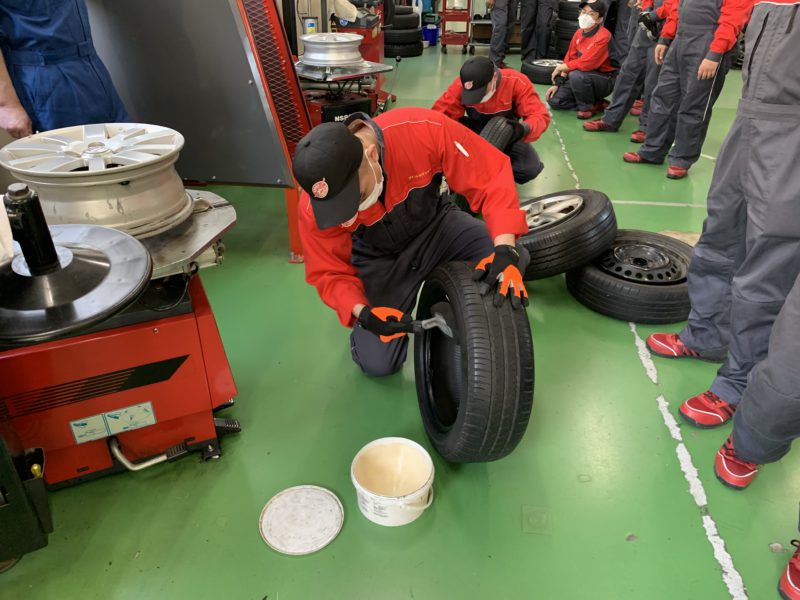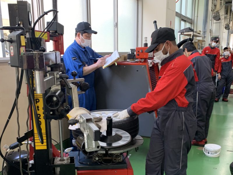 昨日は国際オートメカニック科の1年生がタイヤ空気充填講習をしていました。見に行った時はちょうどテスト中。チェンジャーへの取り付け~タイヤ取り外し~ホイールのチェック~タイヤ取り付け~位置合わせ。真剣に取り組んでます。(yagawa)