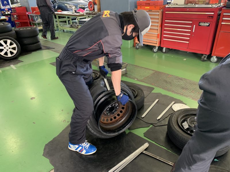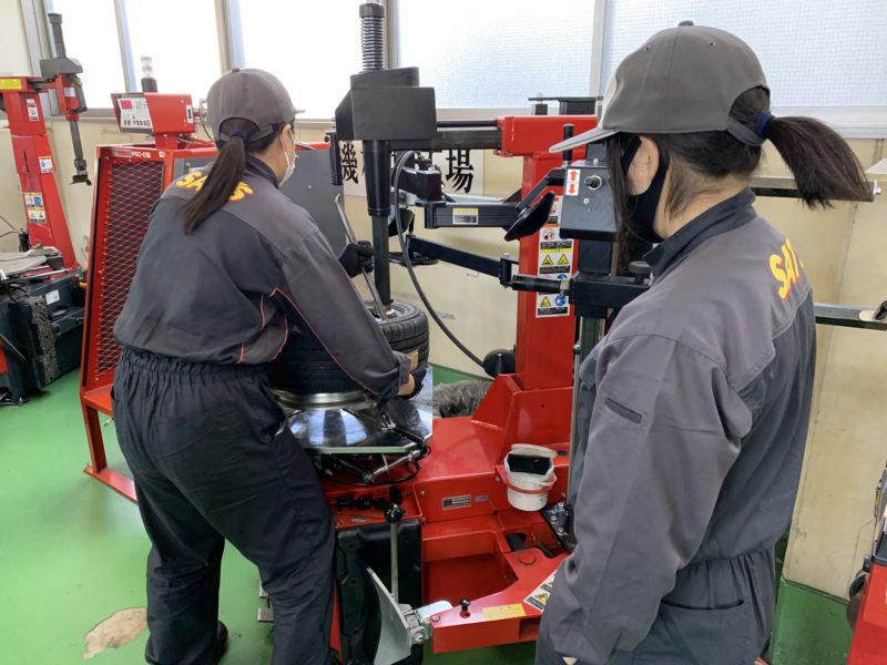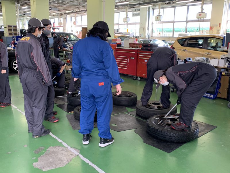 きのうの実習場の様子。自動車システム工学科の1年生がタイヤの脱着の練習をしています。タイヤチェンジャーを用いてその操作方法、コツを掴むため反復練習をしています。一方でビートブレーカーを用いて人力でビートを落としたり、タイヤレバーを用いてホイールとタイヤの脱着をするという方法でも脱着しています。担当は山本先生です。最新機器が無いと何にもできない!では情けないからね。(yagawa)
