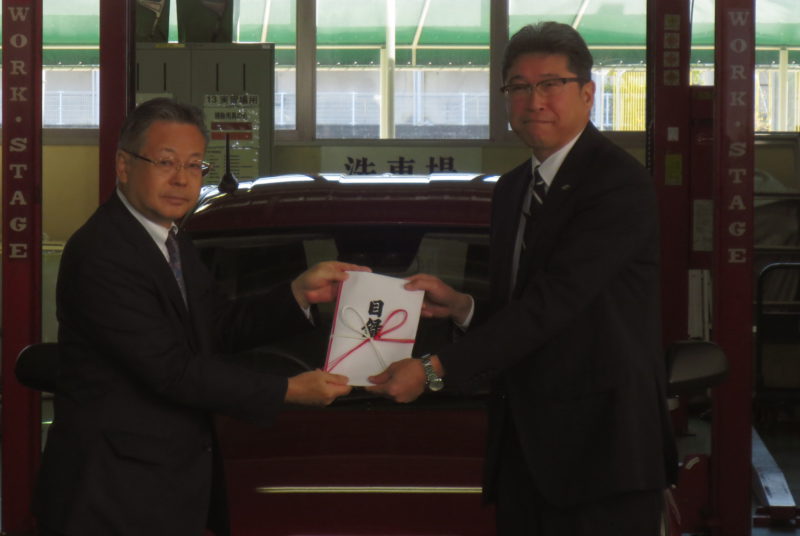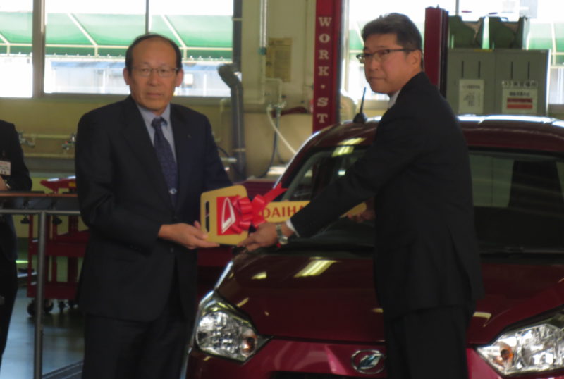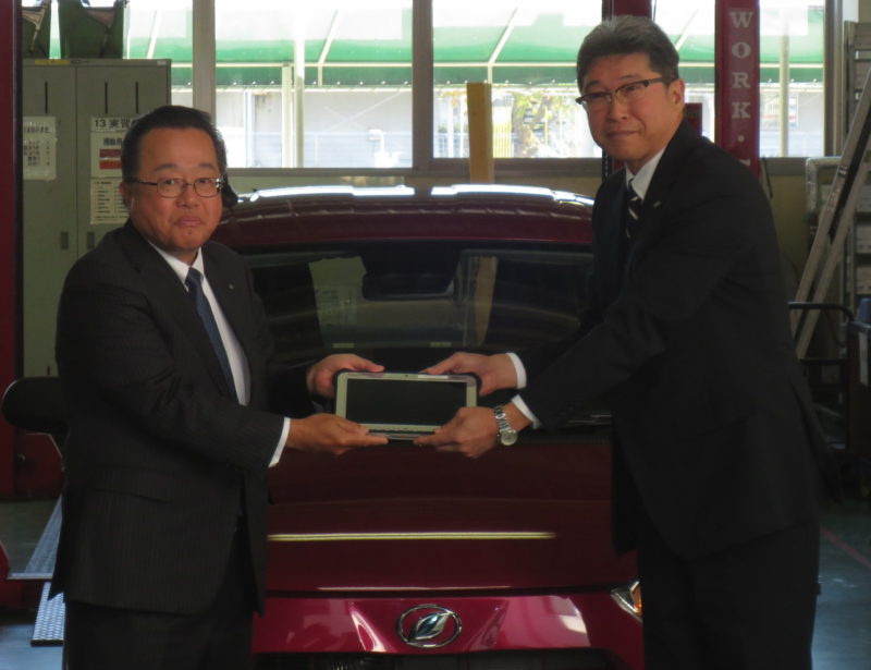 頂いた教材はダイハツ ミライース、故障診断機 DSⅢ、SA調整ツール一式の3点で、静岡ダイハツ販売株式会社 代表取締役社長 井上憲明様よりゴールデンキー、ダイハツ沼津販売株式会社 代表取締役社長 直井稔一様よりDSⅢ本体、山梨ダイハツ販売株式会社 代表取締役社長 田中治行様より目録をそれぞれいただきました。