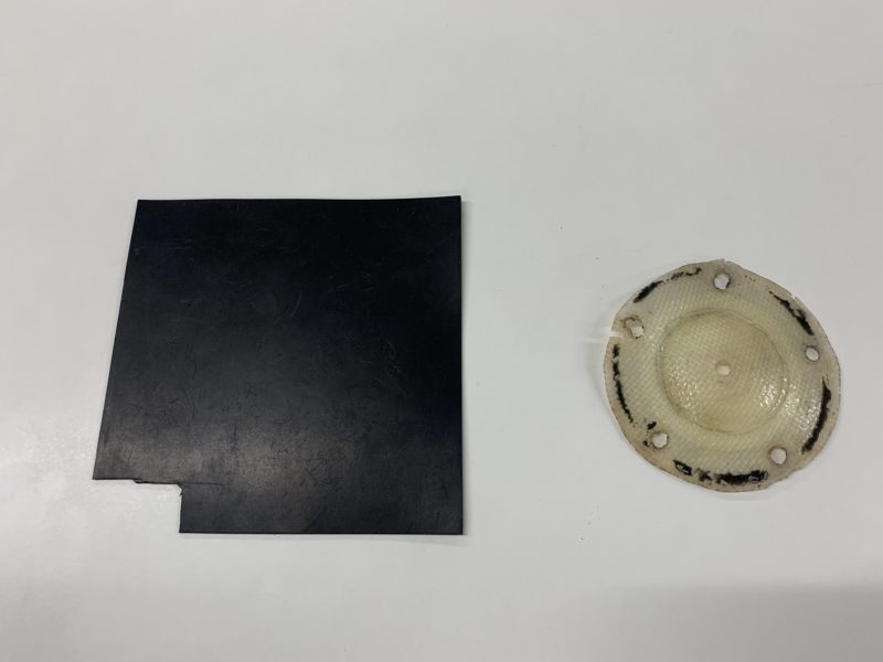 本校のダットサンのフューエル・ポンプは機械式。3年前のレストア時に非分解のダイヤフラム部を無理やり分解修理したがまたまた漏れ出したので分解。前回は自作の膜を作成してみたが今回は市販ゴムをチョイス。ただホームセンターには耐油性に優れたものがなかなか売っていない。ということで耐油性△というゴムを購入し切れ端をガソリンに漬けて実験中!10日ほど漬けたが弾力もあり脆くもなっていない。引き続き実験を続けよう!これでイケるかな!!(yagawa)