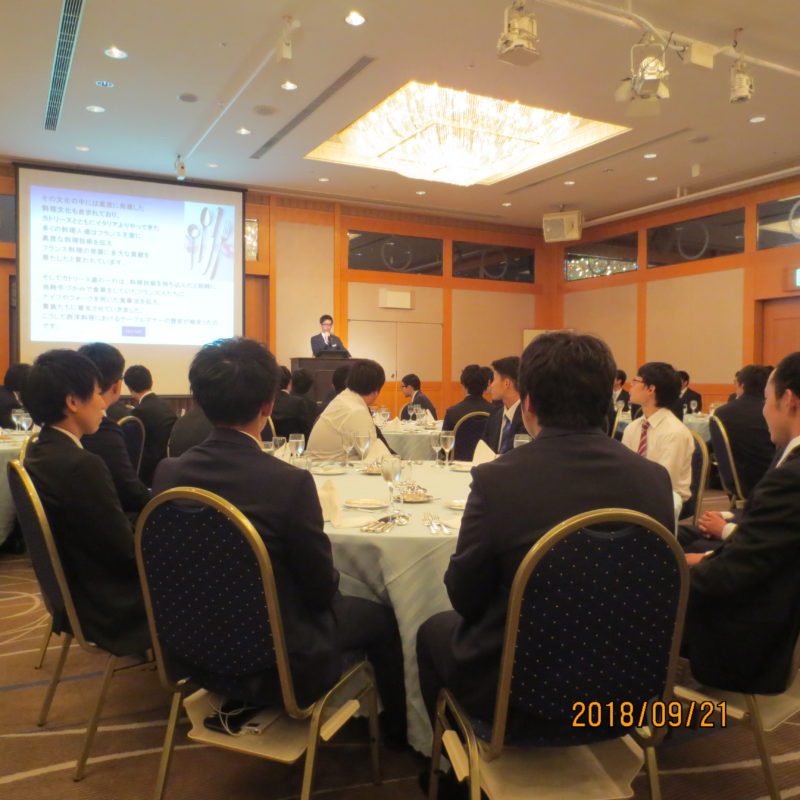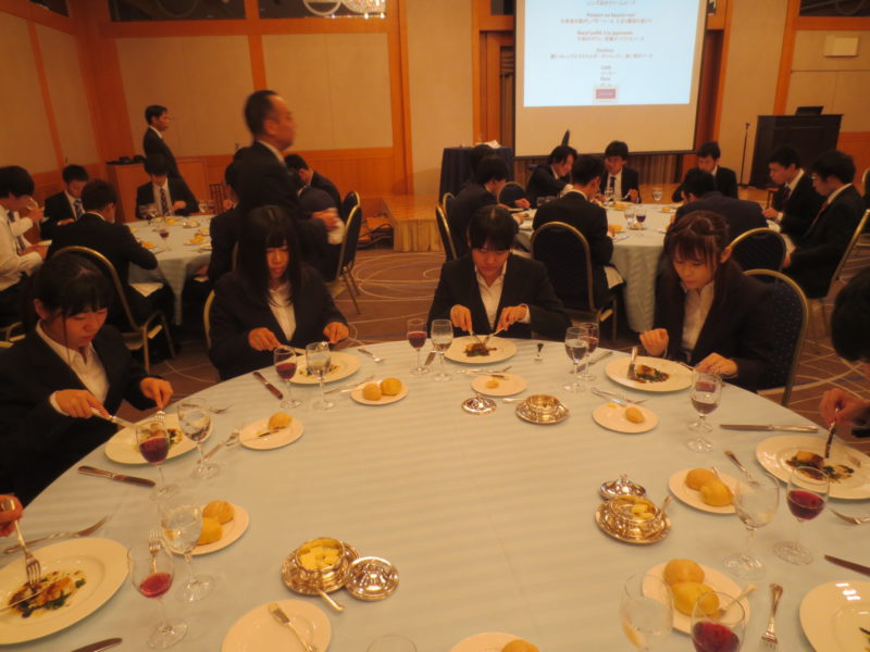これは社会人マナー教育の一環として、テーブル・マナーに関する知識、食事の礼儀作法を学ぶことを目的として、毎年ホテル センチュリー静岡様に依頼して実施していただいている講座です。