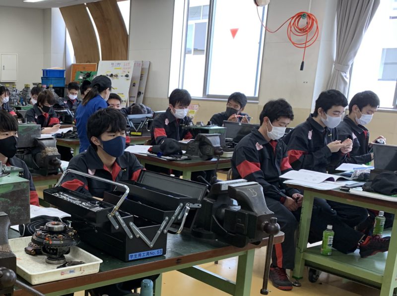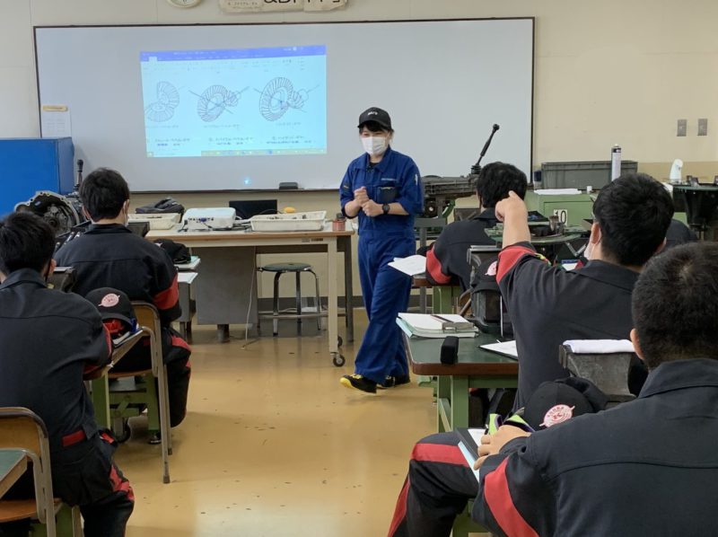 今日の実習場は自動車システム工学科1年生です。覗きに行くと渡辺優姫先生が分解したデフを前に、ストレート・ベベル・ギア、スパイラル・ベベル・ギア、ハイポイド・ギアの名称とその特徴を説明していました。机の間をまわり、学生達の理解度を確認しながら授業を進めます。(yagawa)