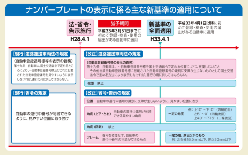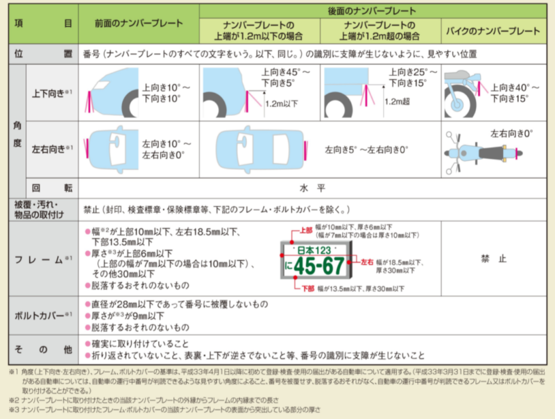 本日10月1日からナンバープレートの表示に関わる基準が変わります。詳しくは添付した表の通りなのですが、左右方向、上下方向の角度など角度まで詳しく規定されました。ノーマルのままでなら問題はありませんが、カスタムする人はきちんと基準を踏まえたうえでドレスアップしましょうね。法を守ってこそのオシャレ、個性に心がけましょうね。2枚目の「新基準の全面適用」がH33.4.1からとなっていますが、延期され本日からなのです。(yagawa)