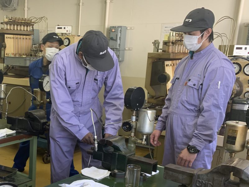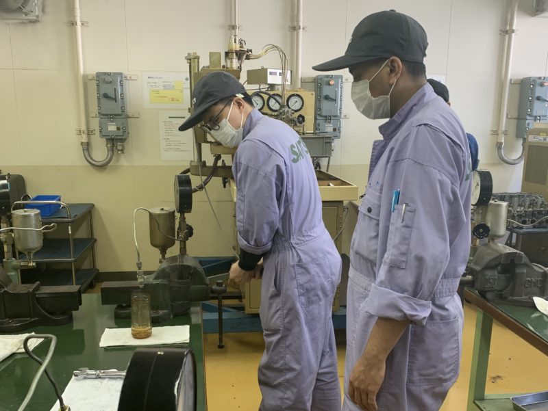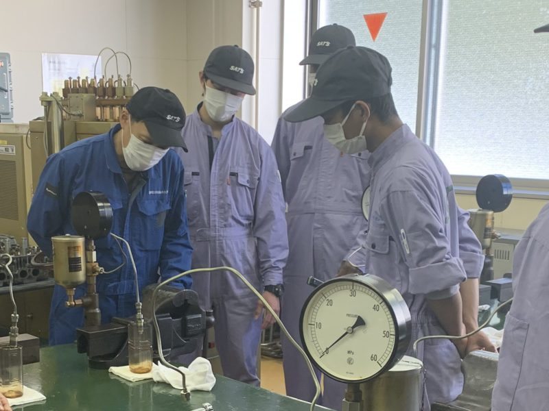 今日は国際オートメカニック科の2年生の実習の様子。渥美先生がノズルテスターの取り扱いを説明しています。テーブルの上に備え付けられたアナログメータのついた道具が噴射ノズルテスターです。ジーゼルエンジンの噴射ノズルを取り付けて、レバーを動かして燃料圧力を掛けて、ノズルの噴射圧力、噴霧の状態、シュナールなどを確認していました。(yagawa)