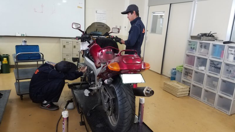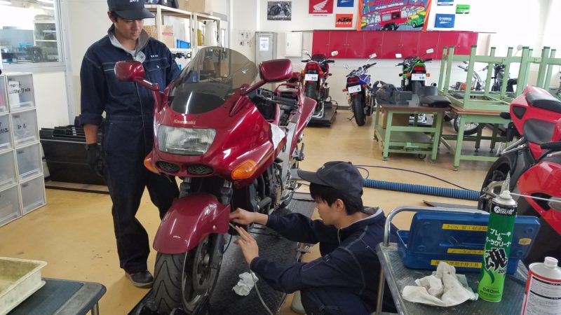 ブレーキフルード(作動油)の交換とエア抜き(空気が噛んでいると力が上手く伝わらず効きが甘くなります)と、ブレーキキャリパー(バイクの車輪側についている部品)の整備を行いました。