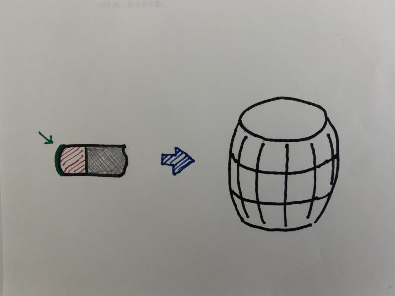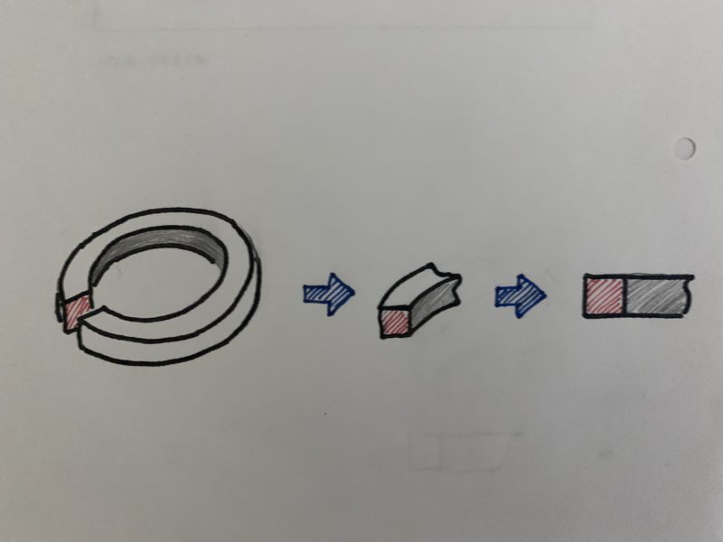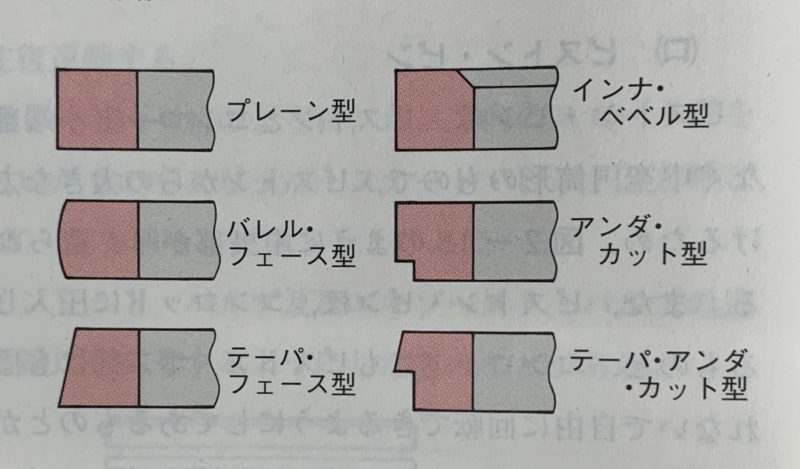 教科書に載っているコンプレッションリングです。(写真1)これってリングの断面を示したものでイメージは写真2の通りです。図中のバレル・フェースですが、写真3のようにシリンダに当たる面(緑の矢印の部分)が樽面(ツラ=フェイス)になっているのでバレル・フェイスというんですよ。樽って英語でバレルって言うんだ!って思った方、ニュースで原油の価格を言い表すときの「1バーレルあたりいくら」とかケンタッキーの「パーティー・バーレル」など聞いたことがあると思いますが、そのバーレル=バレルなんですよ。(yagawa)