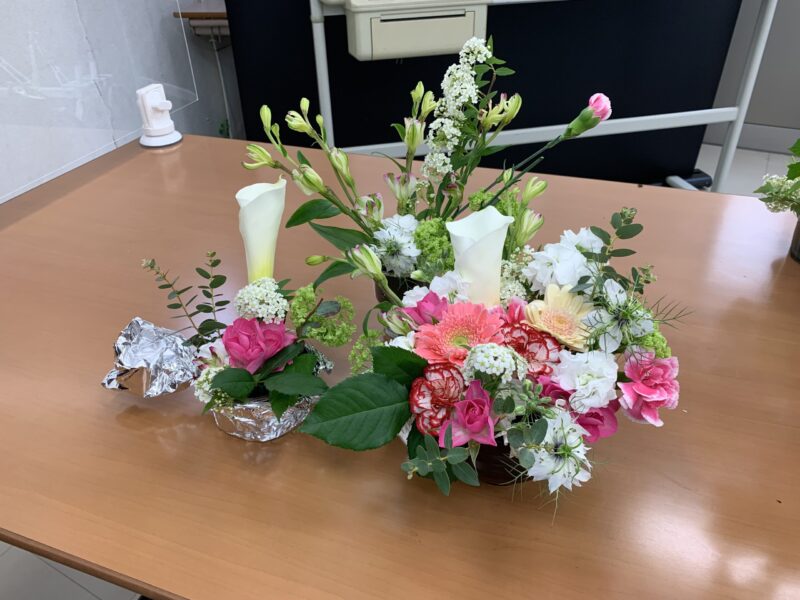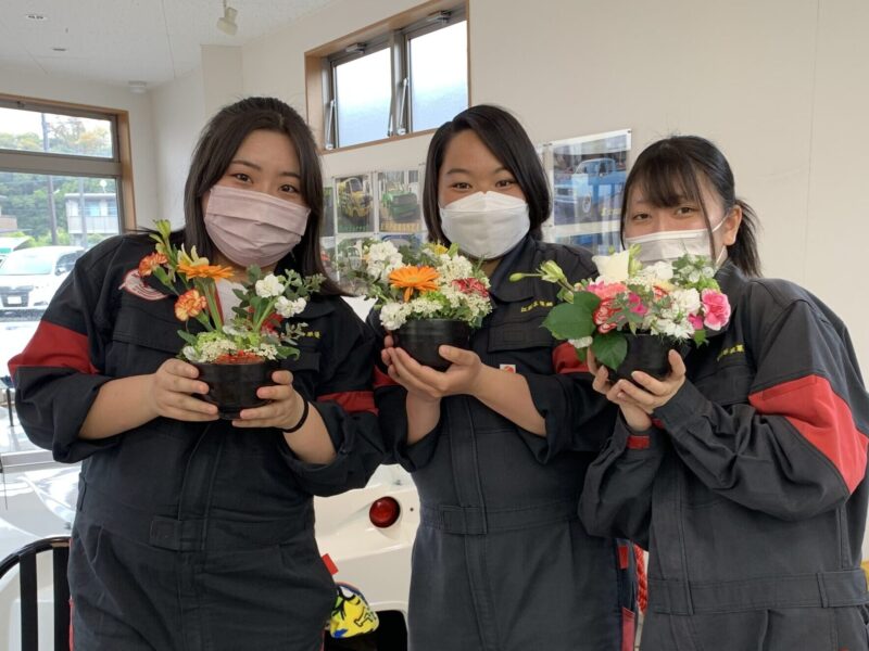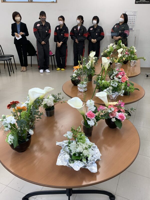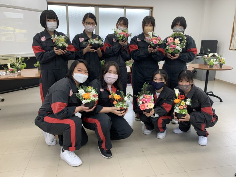 本日、自動車システム工学科&自動車整備科2年生の女子が「ショップコーディネート」(講師の太田玲子先生)の授業でフラワーアレンジメントを作成しました。作成終了後会場に招かれ、製作者個々が自分の作品を紹介してくれました。そののちポットが職員室などに置かれ、部屋を明るく華やかに彩ってくれました。(yagawa)