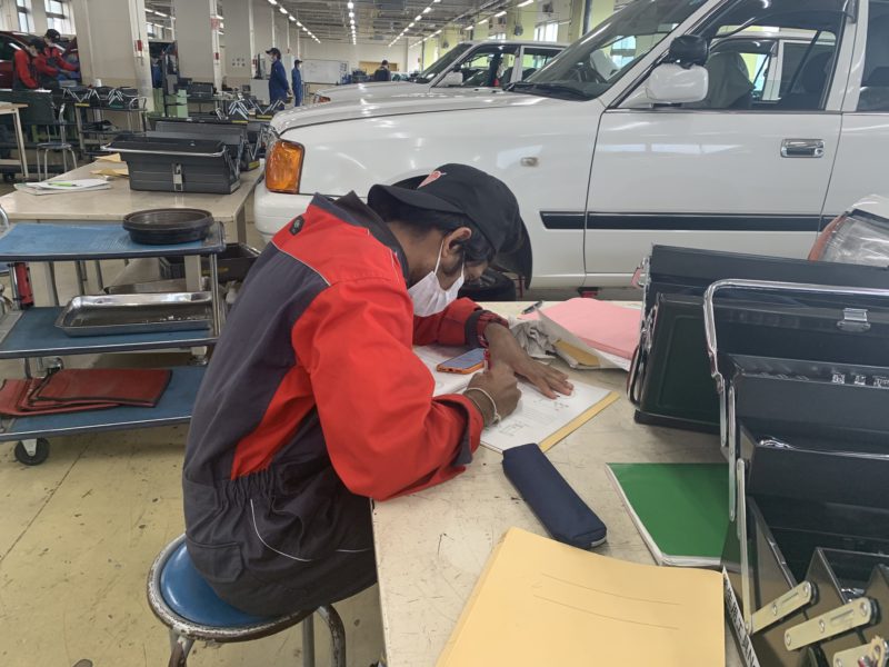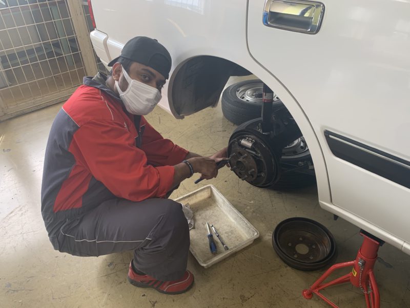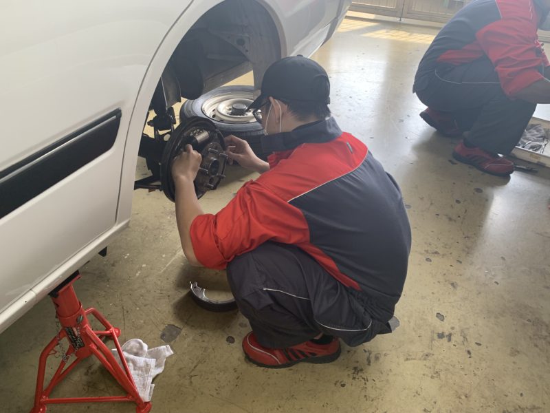 今日は国際オートメカニック科1年生のブレーキの実習の様子です。兼岡先生の担当です。今日は、全員がリアのライニングの脱着の反復練習をしていました。ドラムブレーキのシューを支えている「スプリングシート」を押して「スプリング」を押し縮めながら「シューホールドピン」と「スプリングシート」の位置関係を変えて「取り付ける」または「取り外す」という作業の工具の当て方、力の入れどころが難しいみたい。がんばれ!(yagawa)