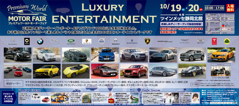 10月19日、20日にツインメッセで開催されるプレミアムワールド・モーターフェアが開催されます。このイベントは正規輸入車ディーラー・インポートより15ブランド100台以上が集結するイベントです。輸入車ではありませんが本校もカスタムカーを展示します。皆さま是非お越しくださいませ(yagawa)