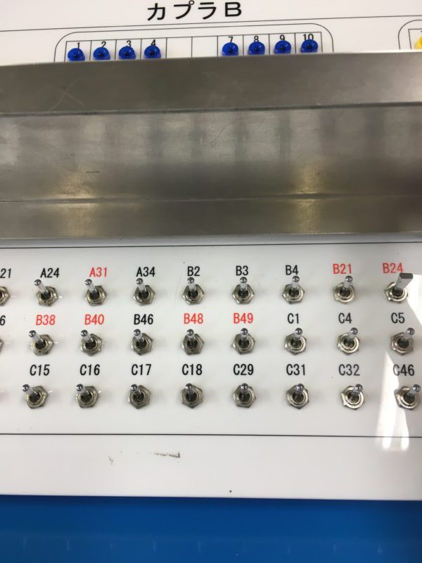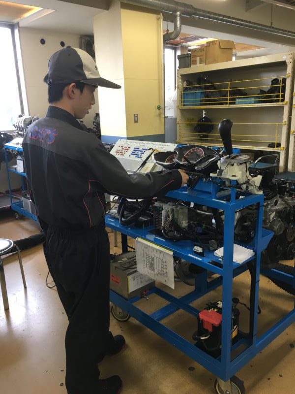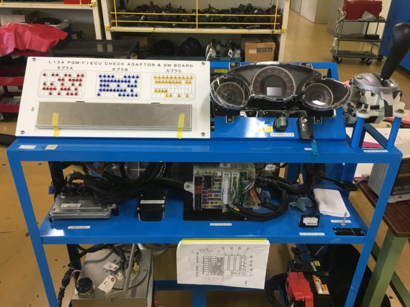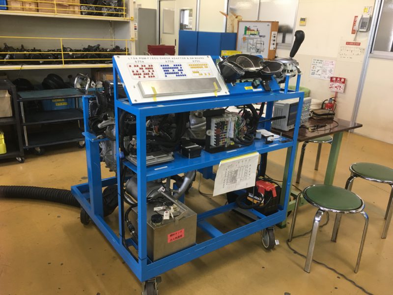 本日紹介するのはベンチエンジンです。ベンチエンジンとは写真のような青い鋼材で構築された枠の中に、市販の自動車と同じようにエンジン、ガソリン・タンク、バッテリー、コンピュータ等が搭載されており配線・配管がされた状態になっています。この状態でエンジンを掛けることができるので、隣に置いた机上でオシロスコープなどを接続して波形観測を行うこともできます。さらに3枚目の写真のように蓋を開けるとトグルスイッチで配線を断線させたり短絡させたりできるので、いろいろな故障の事象を確認したり、蓋を閉めて見えない状態にして故障探究をするなど万能な教材なのです。