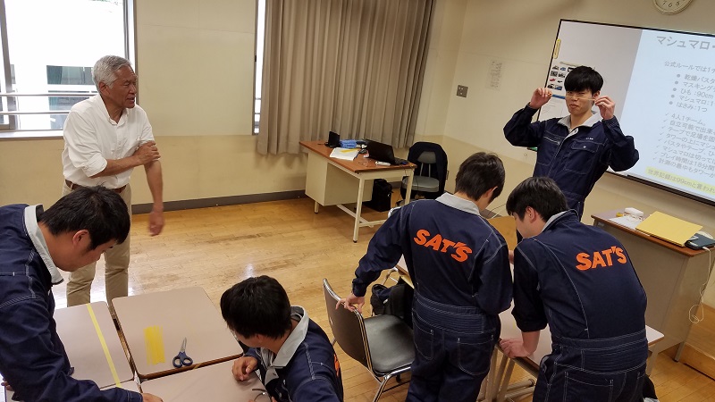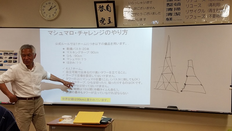 さて今回もエンジン工学の授業内ではありますが、構造力学のおさらいとレクリエーションを兼ねて、世界各国で行われている「マシュマロ・チャレンジ」を2チームに分かれて行いました。(世界記録は99cmだそうです!)
