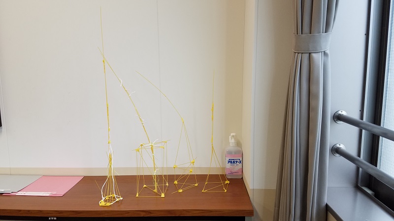 前回学んだトラス構造を取り入れて強いパスタ・タワーを造って1cmでも高くと意気込みますが、マスキングテープの粘着力と長さの制約があり固定に大苦戦。