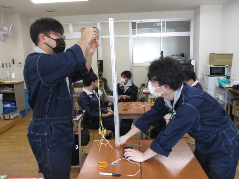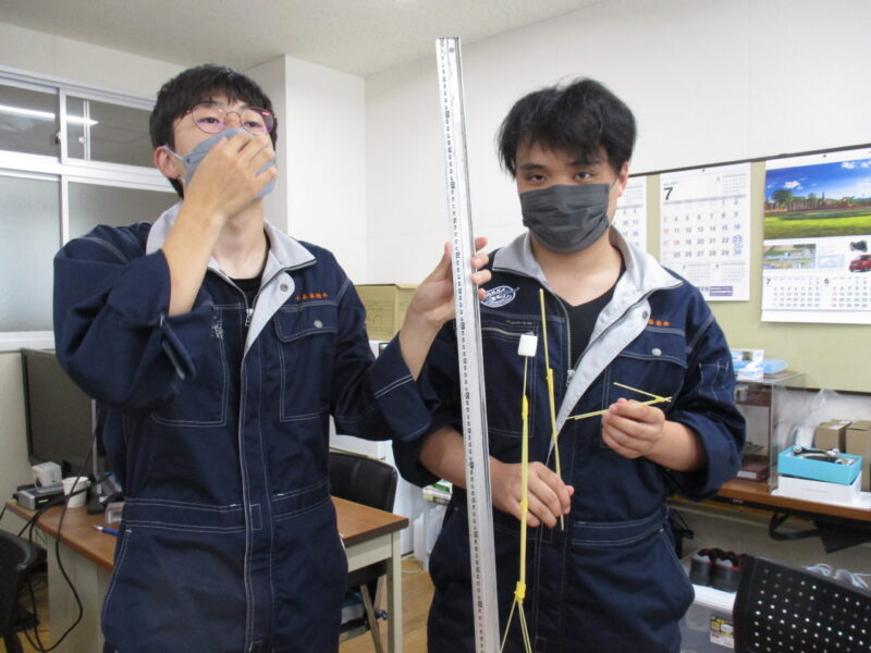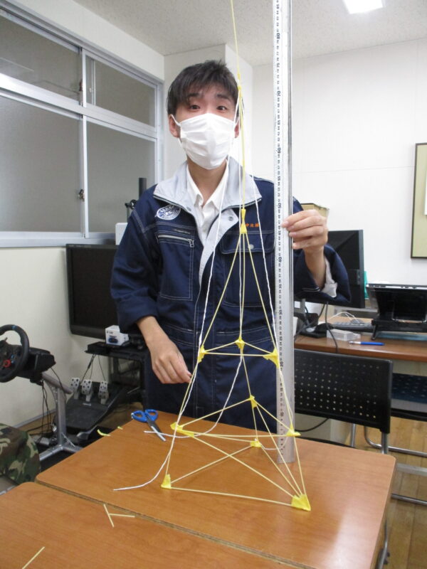 自動車システム工学科開発エンジニアコースの3~4年生です。構造力学で「マシュマロ・チャレンジ」を行いました。(限られた材料でパスタタワーを作り先端にマシュマロを乗せ、その高さを競います。)