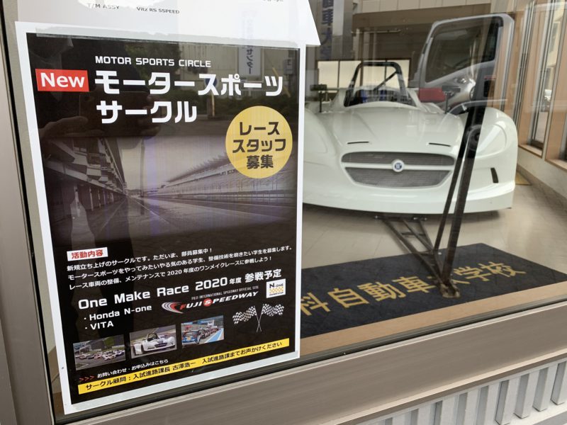 本校に入ってすぐ左にあるショールーム。その中に以前にも紹介したVITA(レーシングカー)が入っています。実は2020年度この車両やホンダのN-oneを使用したワンメークレースへの参戦を予定しちゃってます。現在「モータースポーツサークル」ではこれらのレーススタッフを絶賛募集中です。FISCOでのピットスタッフを夢見る貴方!まずはうちの学校の願書を持ってGo!(yagawa)