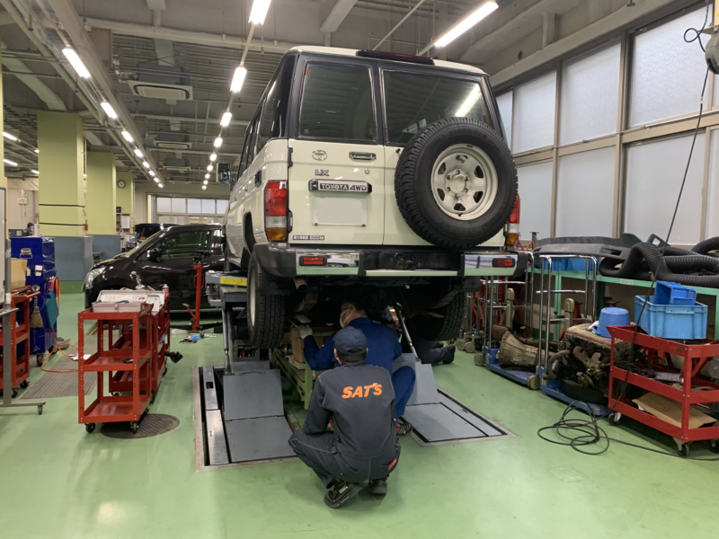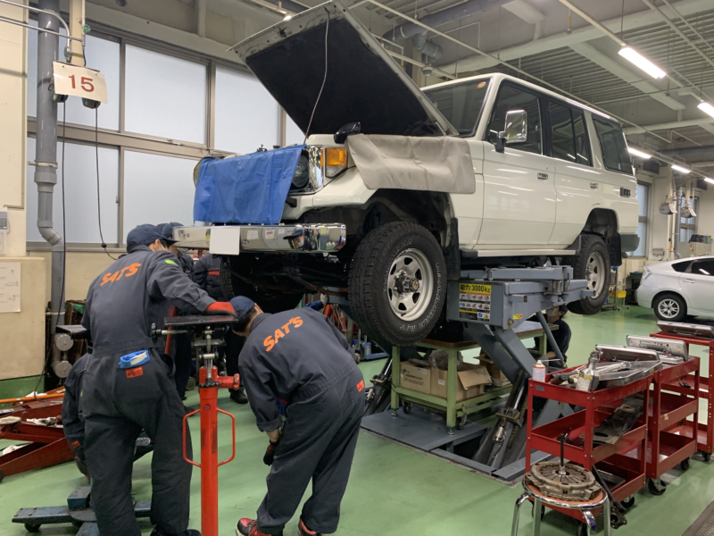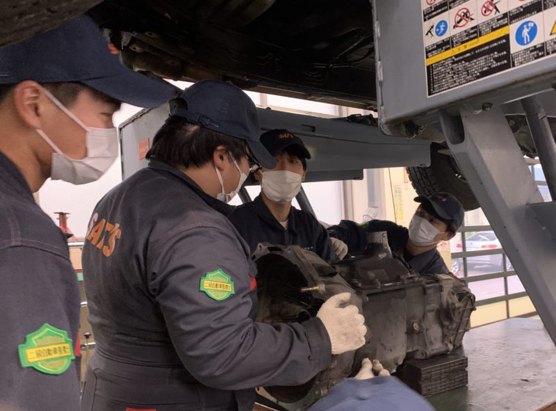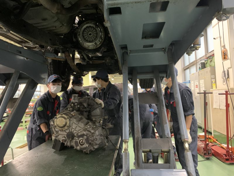 実習場では、自動車システム工学科の4年生がランクル70のクラッチをOH(オーバーホール)しています。クラッチの交換後、折り返しT/M(トランス・ミッション)+トランスファを載せる作業中だったのですがコイツがメチャ重のようです。本校のミッション・ジャッキでは支えられず、テーブルに載せてチャレンジ中。悪戦苦闘しています。ちなみに杉山先生の愛車です。(yagawa)