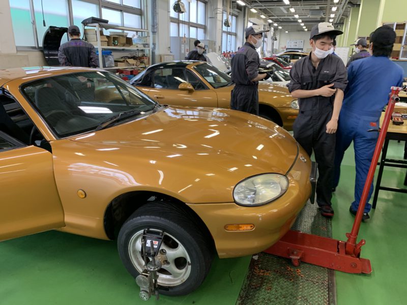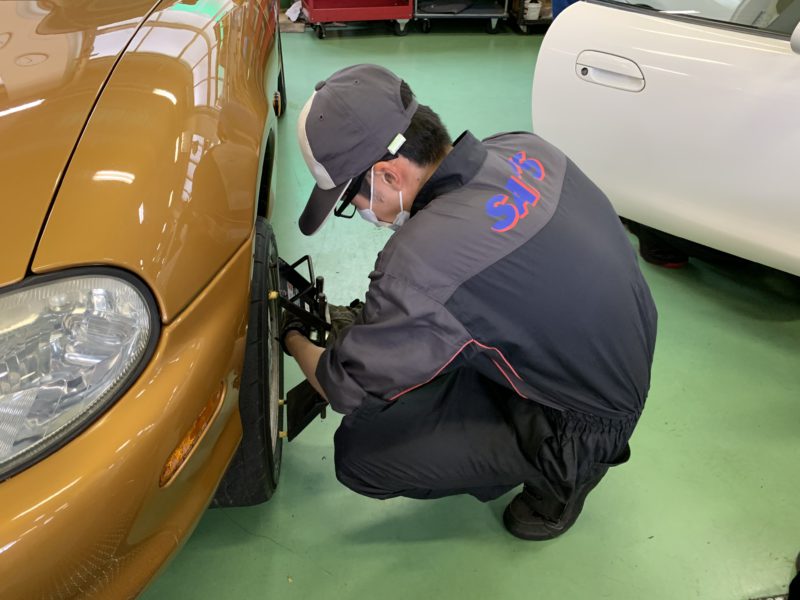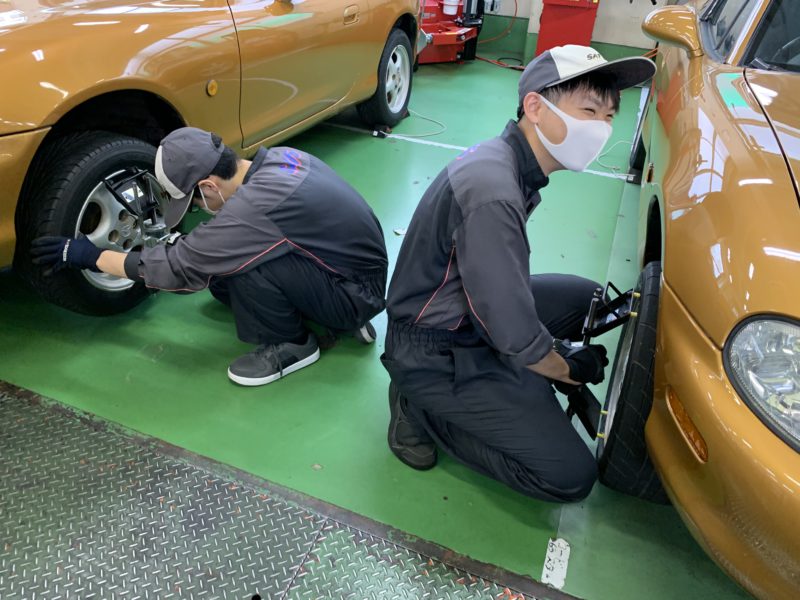 今日は自動車システム工学科2年生がNBのロードスターでアライメントの測定をしています。