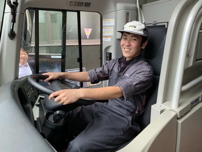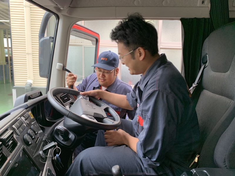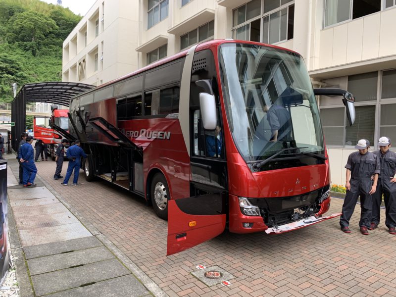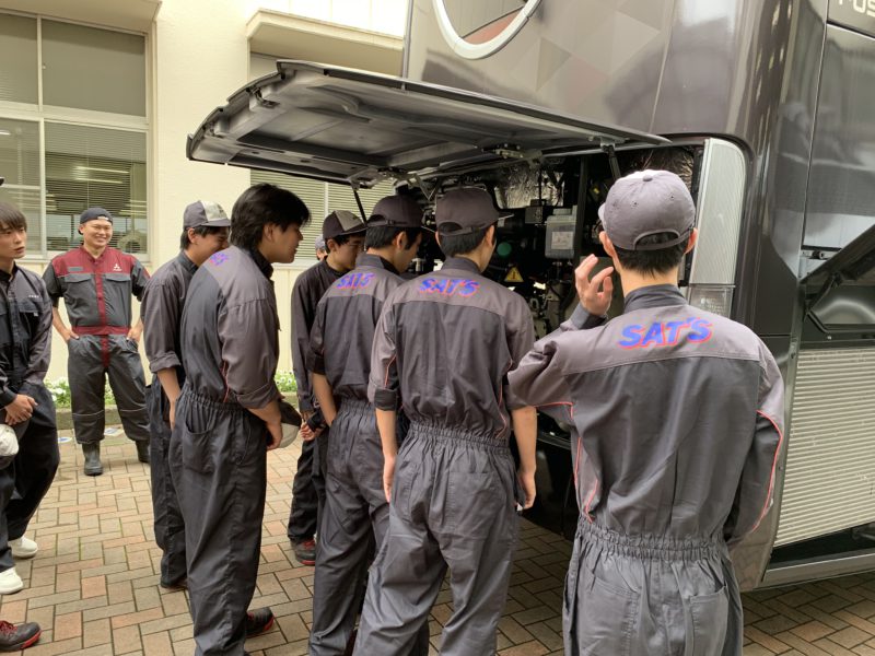 本日の午後、三菱ふそう様による企業実習があります。それに先立ち午前中のうちにトレーラーヘッド「スーパーグレート」と観光バス「エアロクイーン」をお持ちいただき、実習を受ける対象の学生以外にも披露していただきました。普段乗用車を主な教材として勉強している学生達には、すべてにおいてその大きさは規格外に見えるようで、そのスケールの大きさに圧倒されていました。(yagawa)