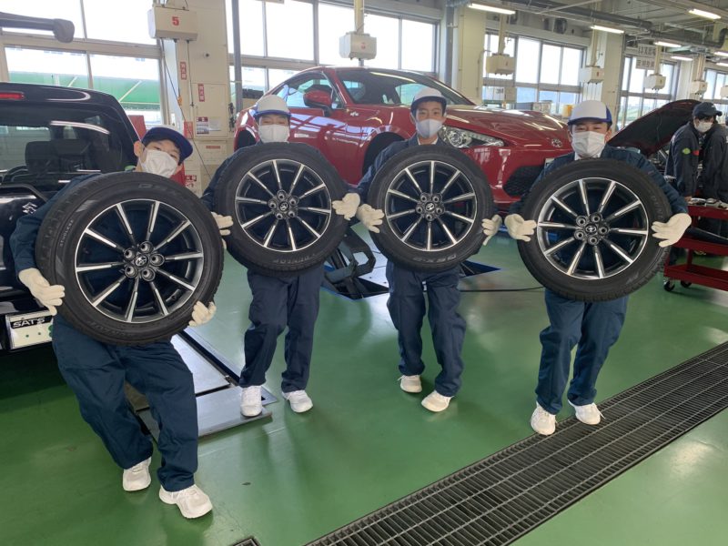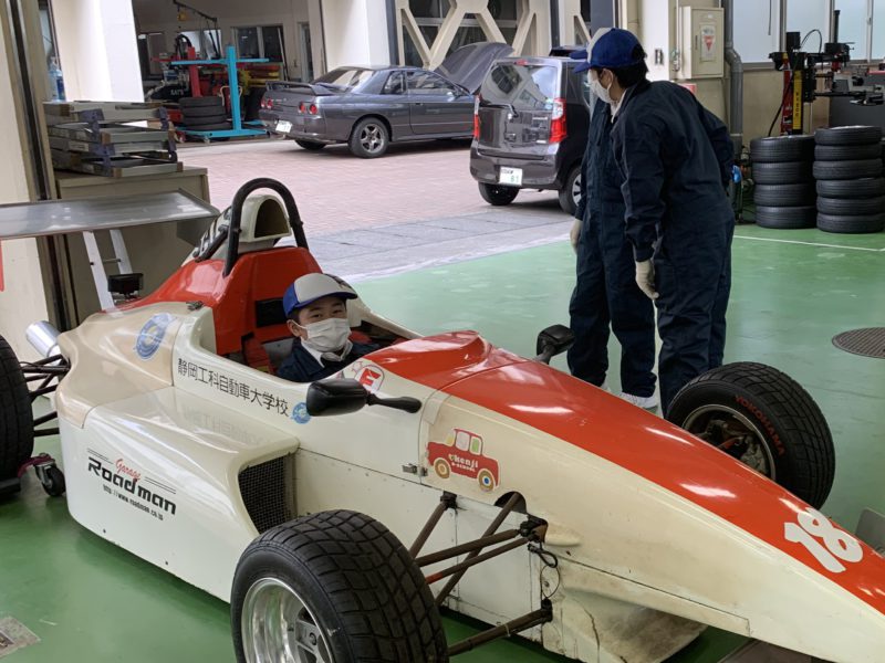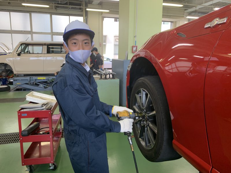 本日、裾野市立西中学校の2年生4名が本校の見学にやってきました。専門学校の役割や整備士という仕事について話をした後、つなぎに着替えて整備士のプチ体験をしてもらいました。タイヤの脱着に感動し、86のエンジンを吹かしては感動し、レーシングカーに乗り込み感動し・・・喜んでもらえて良かったです。