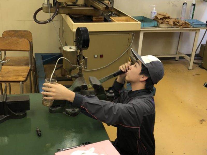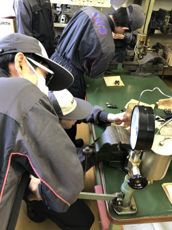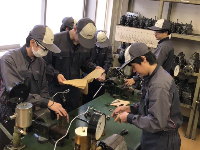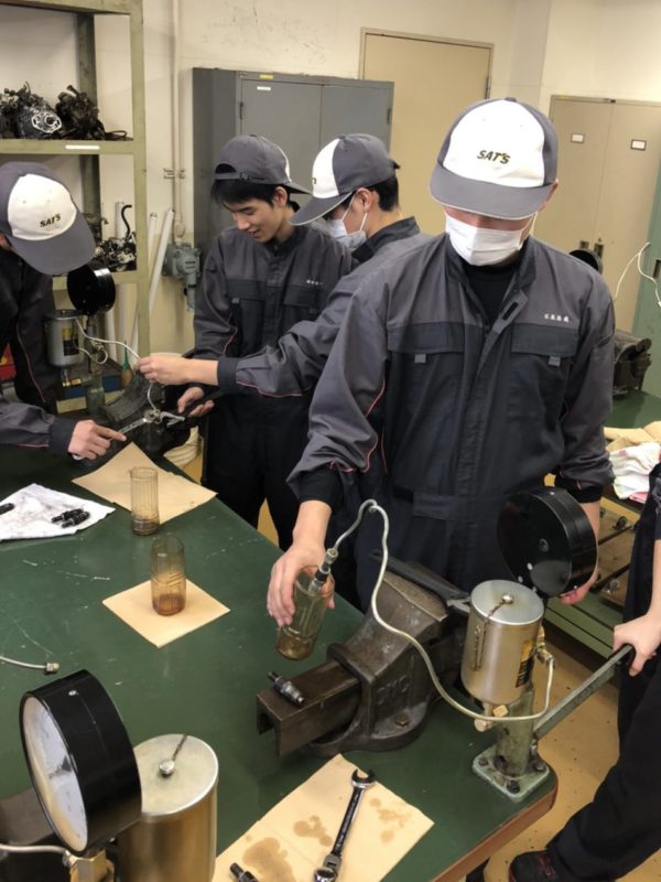 自動車システム工学科の1年生がジーゼルエンジンの噴射ノズルの検査しています。みんなアナログのメーターを見ながらレバーに手を掛け、ヘナヘナッとしたパイプの先にカットしたペットボトルを当てています。これはノズルをテスタに取り付け、実際に燃料に圧力を掛けながら噴射開始の圧力や噴霧の状態を点検しているのです。写真は堀内先生提供です。(yagawa)