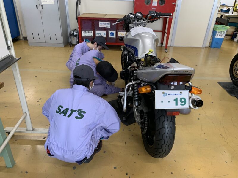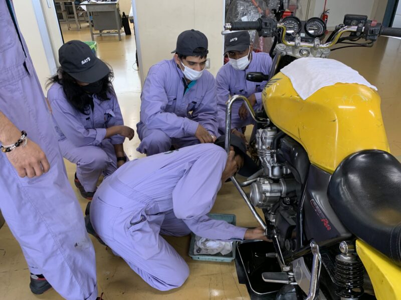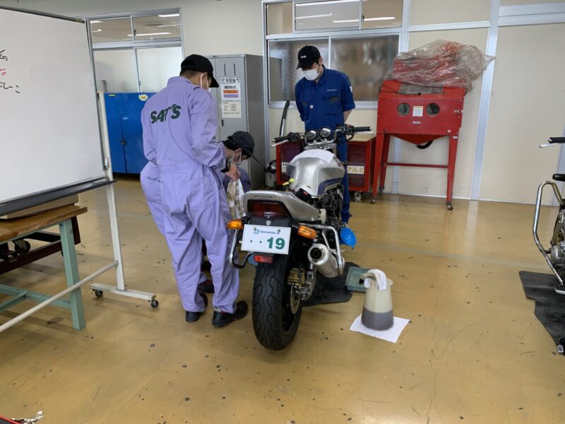 今日は国際オートメカニック科の3年生。昨年度からツナギのデザインを刷新したので、この藤色のツナギもこの学年が最後です。2輪車実習は最後の仕上げでエンジンオイルの交換作業中でした。国際オートメカニック科は、年度途中で整備士試験を受験するので、この後2級整備士対策に入るようです。(yagawa)