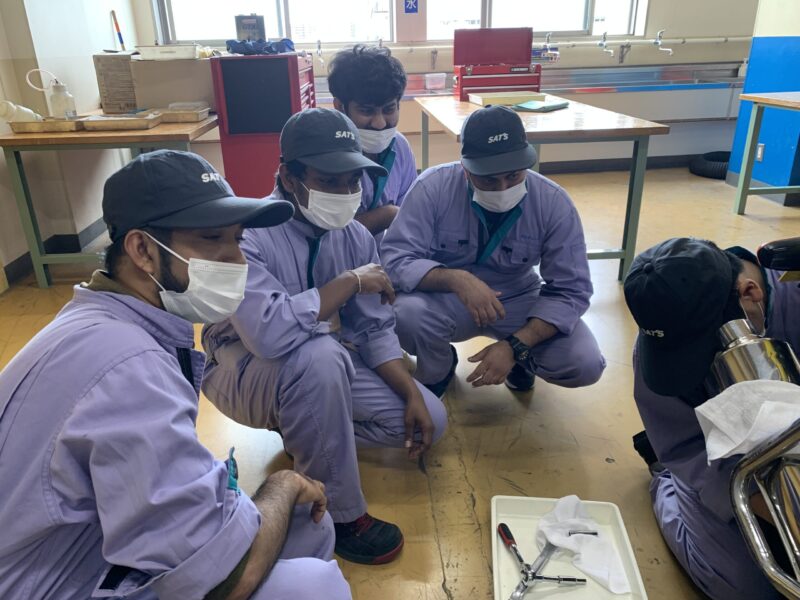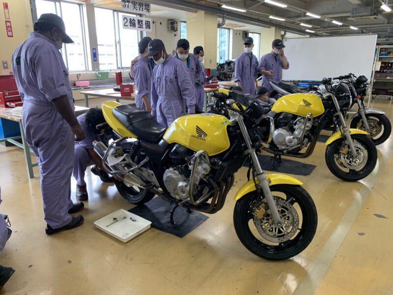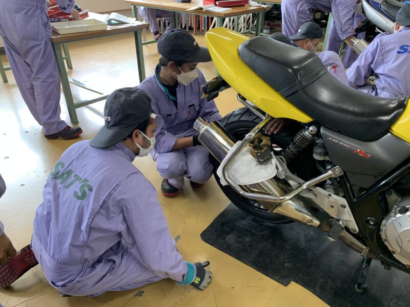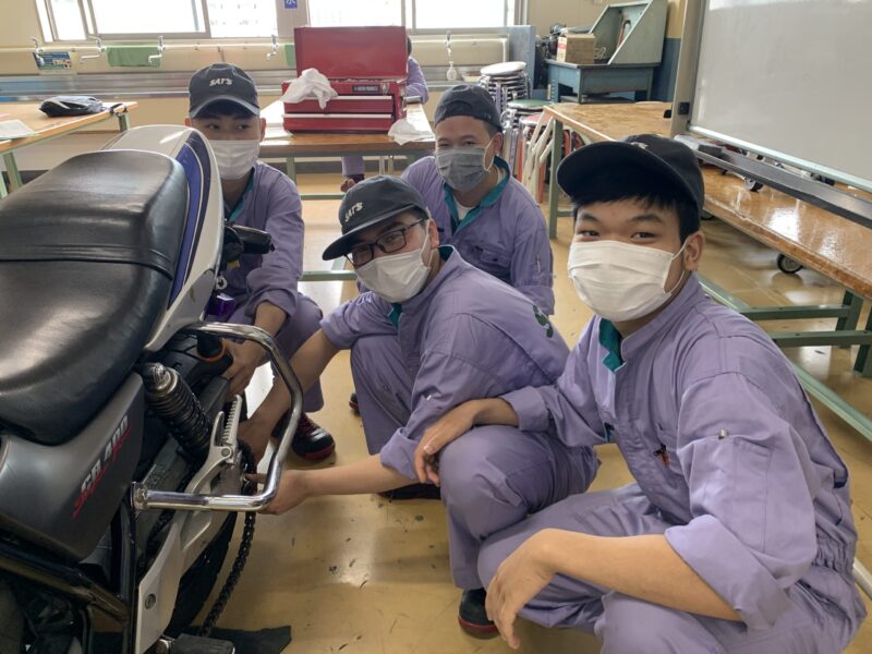 今日は国際オートメカニック科の3年生の2輪車実習。この後リアタイヤの脱着の試験があるので、順番に何度も脱着の練習をしています。ドライブシャフトがなかなか入らず苦労しています。このクラスへは昨年度私も授業に入ったので「センセイ、ヒサシブリデス!」とフレンドリーに挨拶してくれます。可愛い奴らです。(yagawa)
